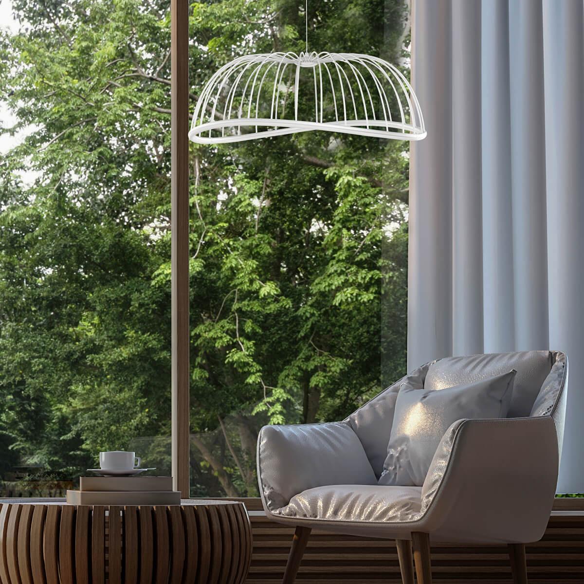Высота светильника составляет 1900 мм, а диаметр плафона - 810 мм. Материал плафона и основания - алюминий, что придает светильнику легкость и прочность. Цвет плафона и основания - белый, что делает его универсальным и легко сочетаемым с любым интерьером.