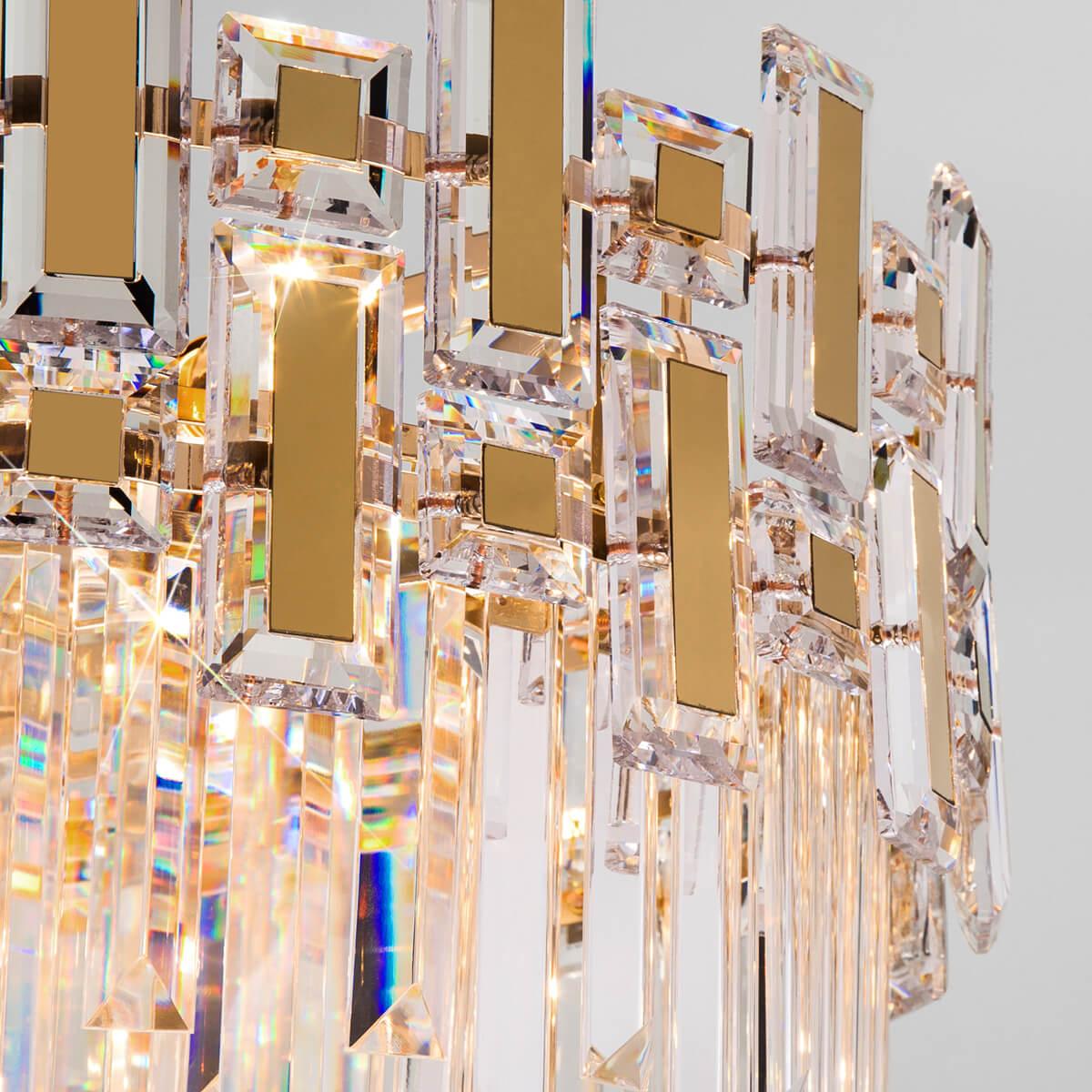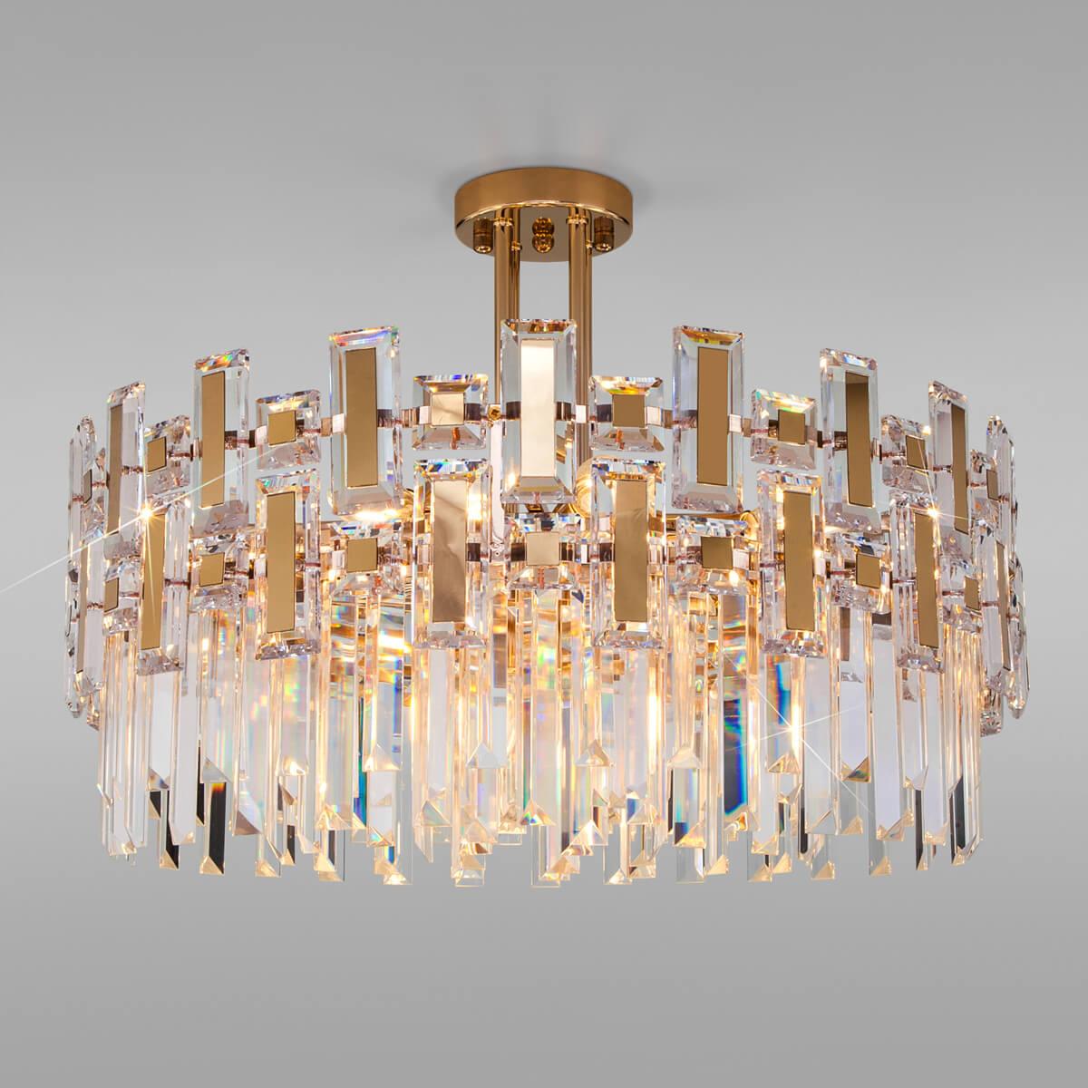 Цветовое решение люстры - золото с прозрачными плафонами, что создает эффектный световой эффект в помещении. Такой дизайн подойдет для интерьеров в классическом и роскошном стиле.