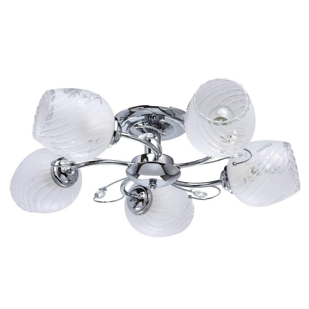 Люстра оснащена пятью цоколями E27 под лампы накаливания мощностью до 60 Вт каждая, общая мощность составляет 300 Вт. Диаметр плафона составляет 570 мм, а высота - 140 мм. Установка осуществляется на потолок, что позволяет равномерно осветить всю комнату.