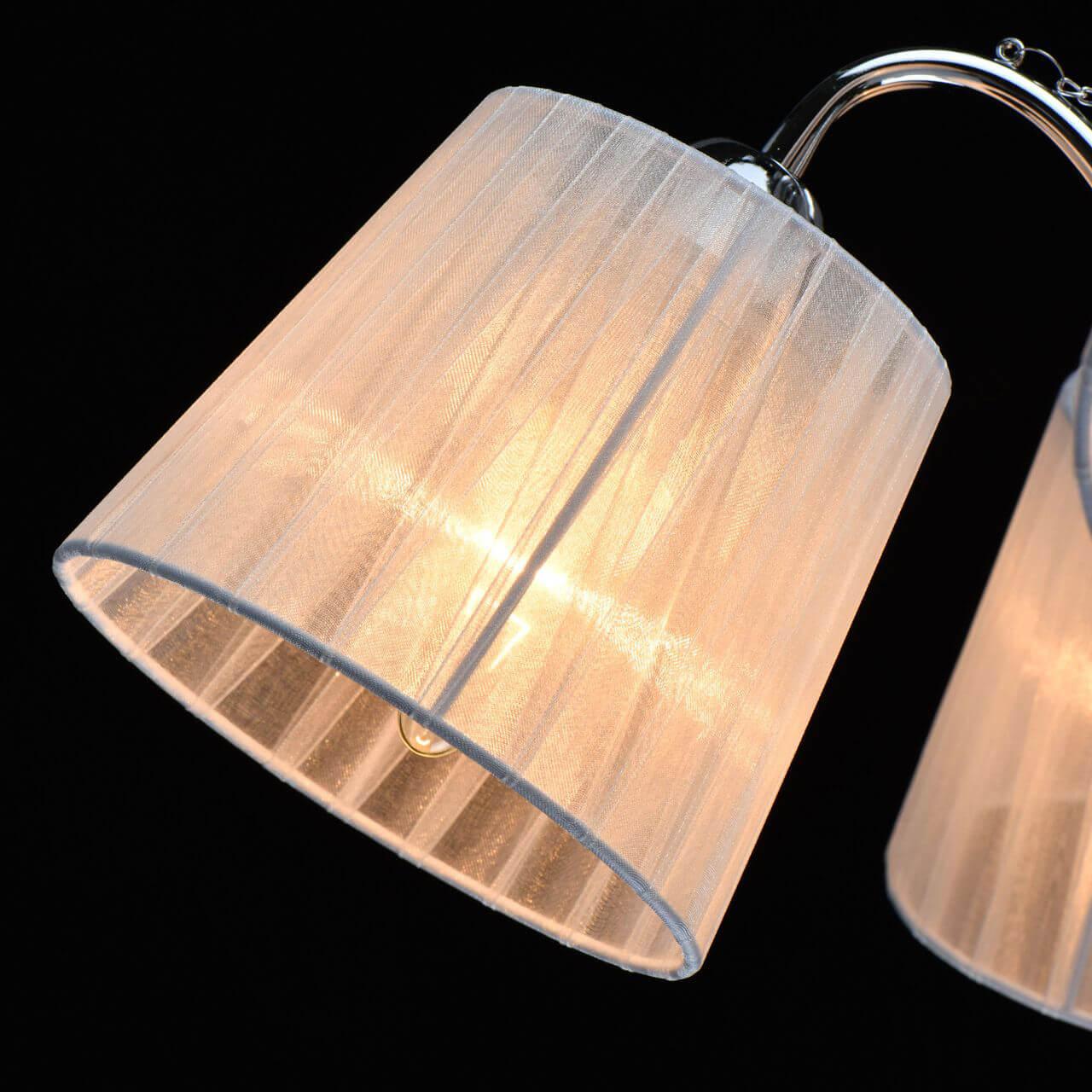 Основание люстры выполнено из металла с хромированным покрытием, что придает ему элегантный и современный вид. Форма плафона - конусная, что добавляет изысканности и стиля в интерьер. Степень защиты IP20 гарантирует безопасность использования в помещениях.