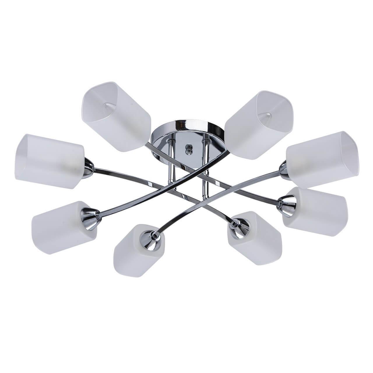 Потолочная люстра De Markt Олимпия 638012208 - это стильный и современный элемент интерьера, который подойдет для гостиной. Произведена в Германии, она отличается высоким качеством и надежностью.Люстра имеет 8 лампочек с цоколем E14 и общей мощностью 480 Вт. Материал плафона и абажура - стекло, что придает изделию изысканный вид. Диаметр плафона составляет 680 мм, а высота - 160 мм. Основание выполнено из металла с хромированным покрытием, что придает ему долговечность и стойкость к внешним воздействиям.