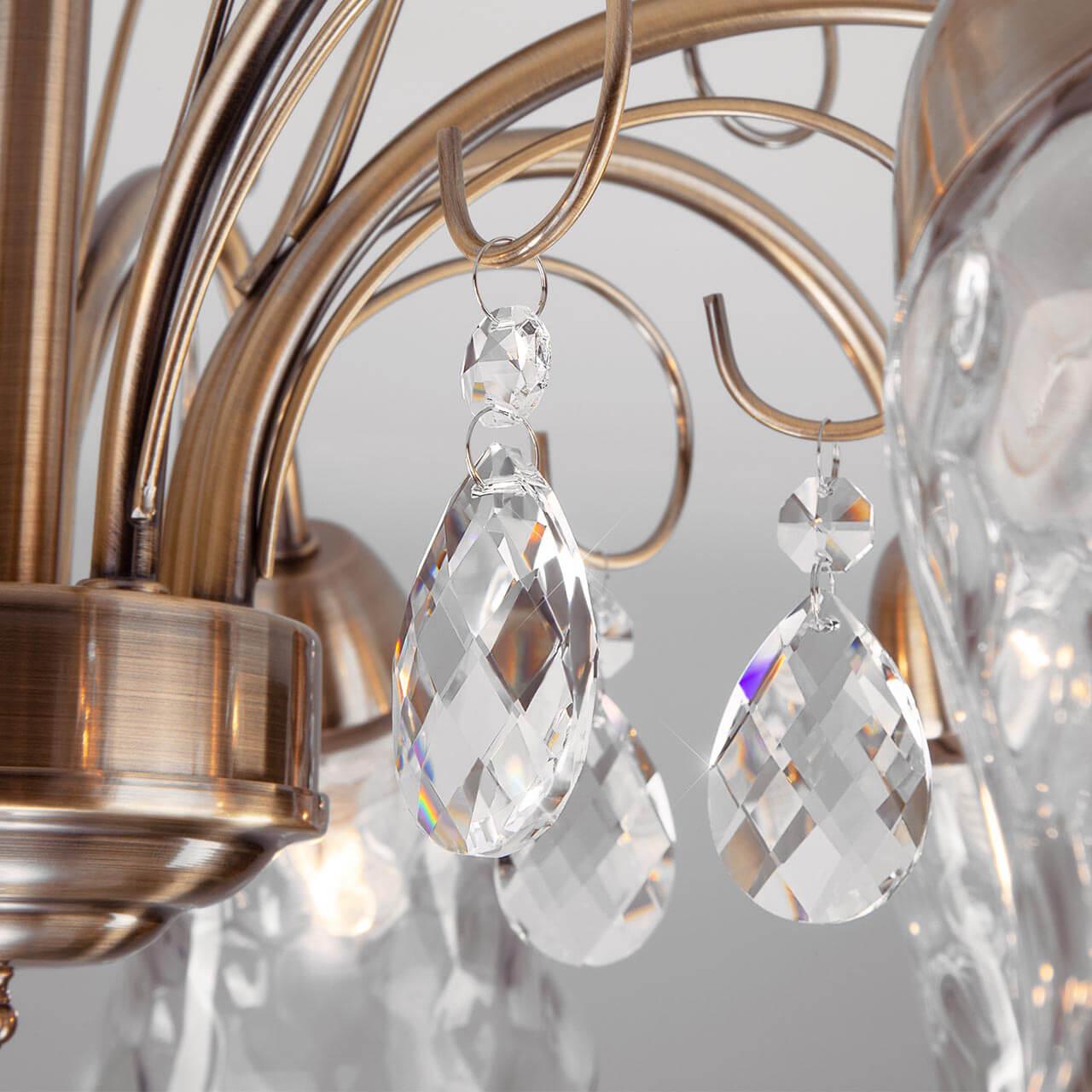 Плафоны и абажуры выполнены из прозрачного стекла, что создает красивый световой эффект и придает интерьеру изысканность. Основание из металла в бронзовом цвете дополняет общий стиль люстры, делая ее элегантным акцентом в помещении.