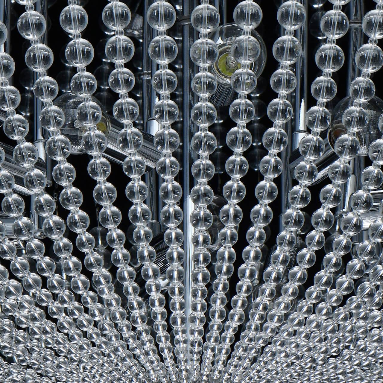 Диаметр люстры составляет 900 мм, а высота - 420 мм. Она устанавливается на потолок и имеет степень защиты IP20. Цвет плафона прозрачный, а основание выполнено из металла с отделкой под хром.