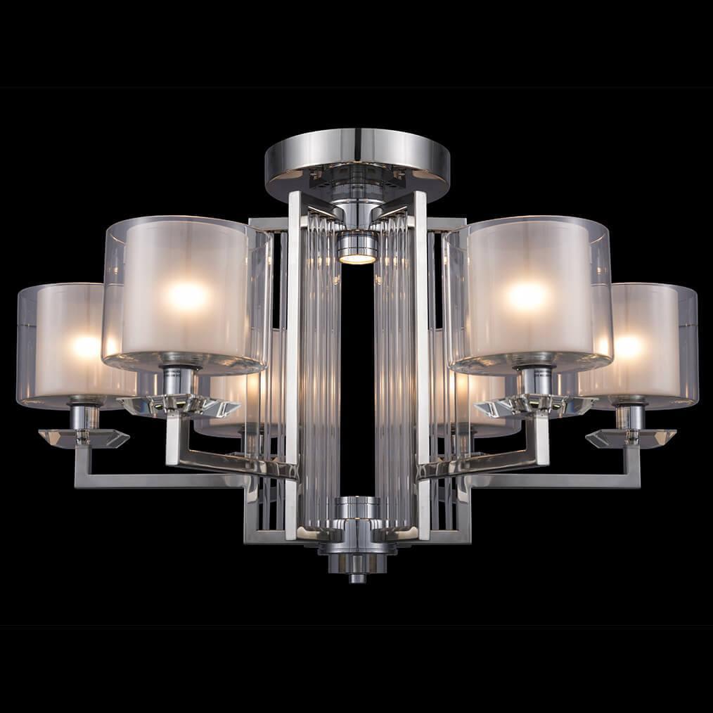 Плафон и абажур выполнены из стекла белого цвета с прозрачным оттенком, что создает приятное и мягкое освещение. Основание из металла с хромированным покрытием придает люстре современный и стильный вид.