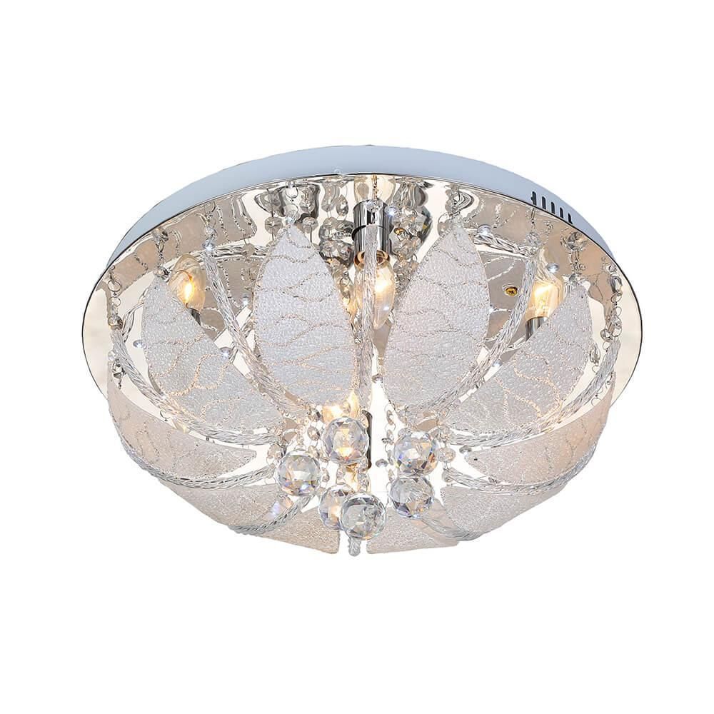 Светильник оснащен пятью цоколями E14, что позволяет использовать лампочки накаливания мощностью до 60 Вт каждая. Общая мощность светильника составляет 300 Вт, что обеспечивает достаточное освещение помещения. Диаметр люстры составляет 500 мм, а высота - 240 мм, что делает ее идеальным выбором для помещений с высокими потолками.