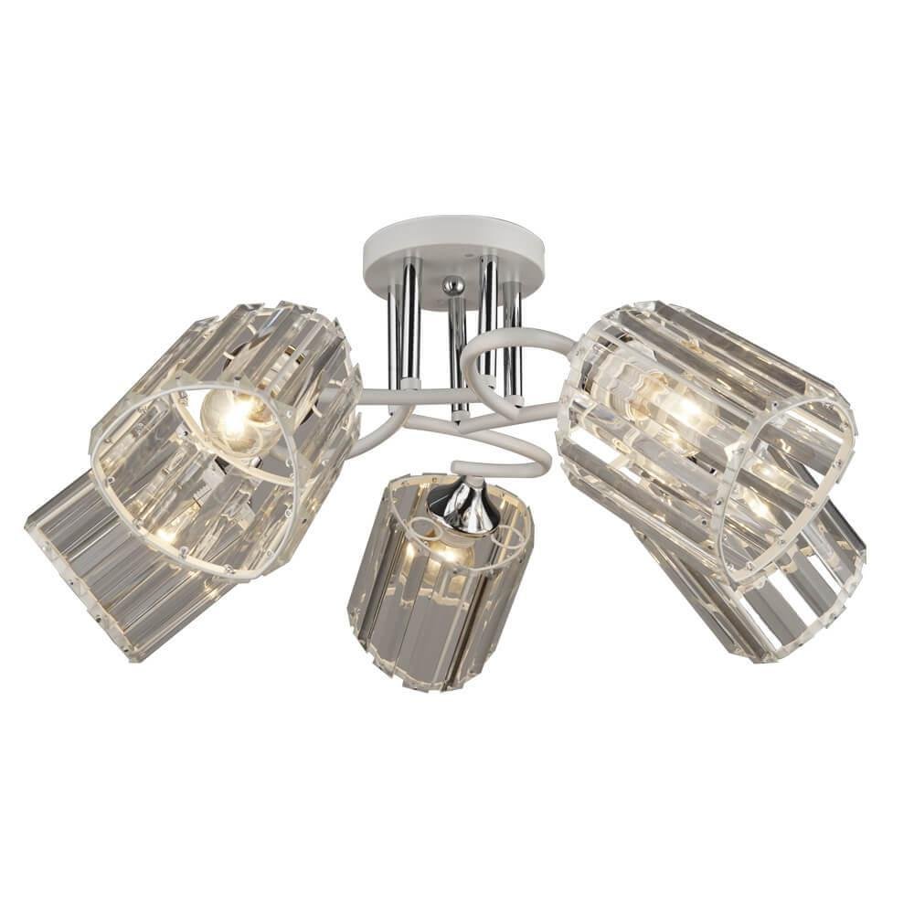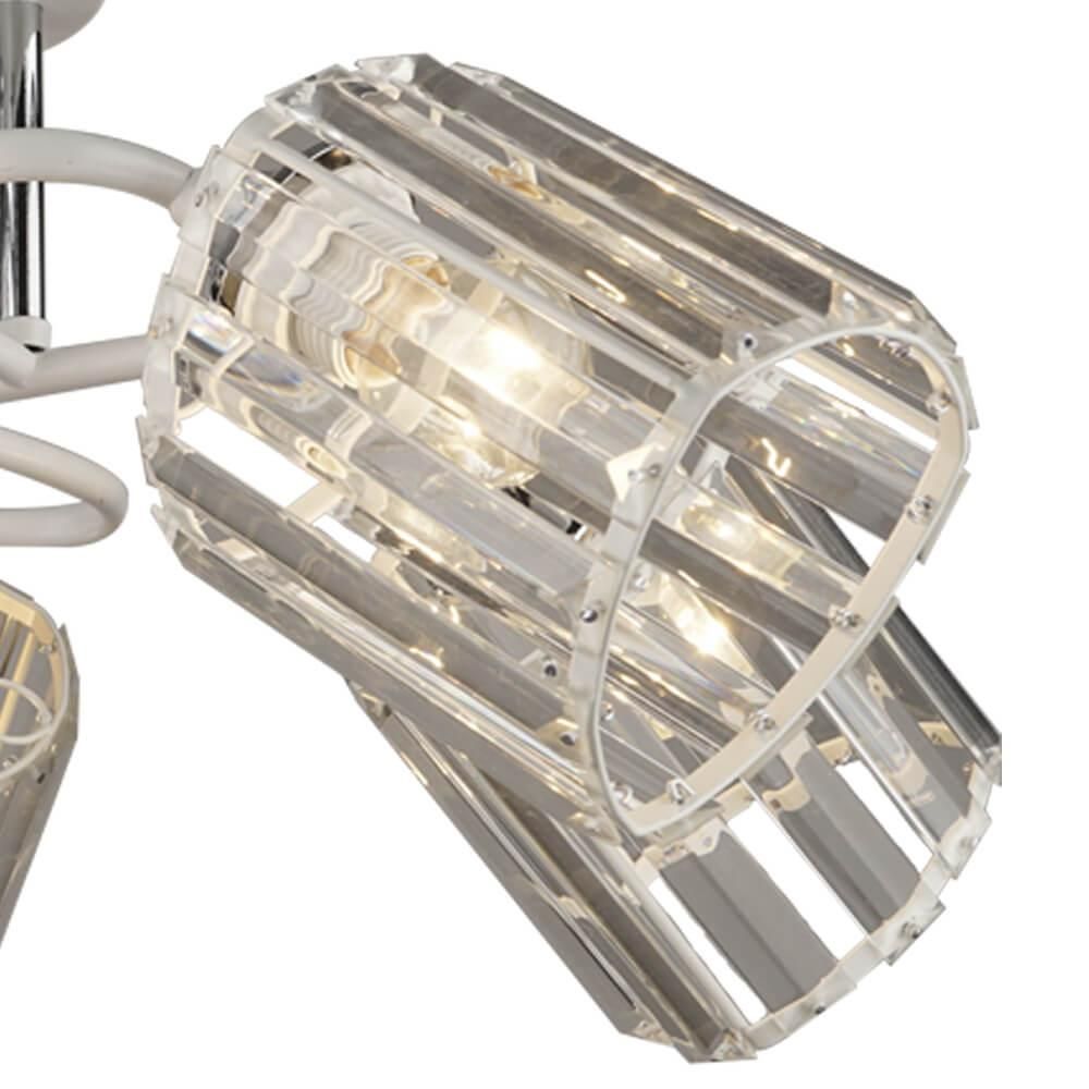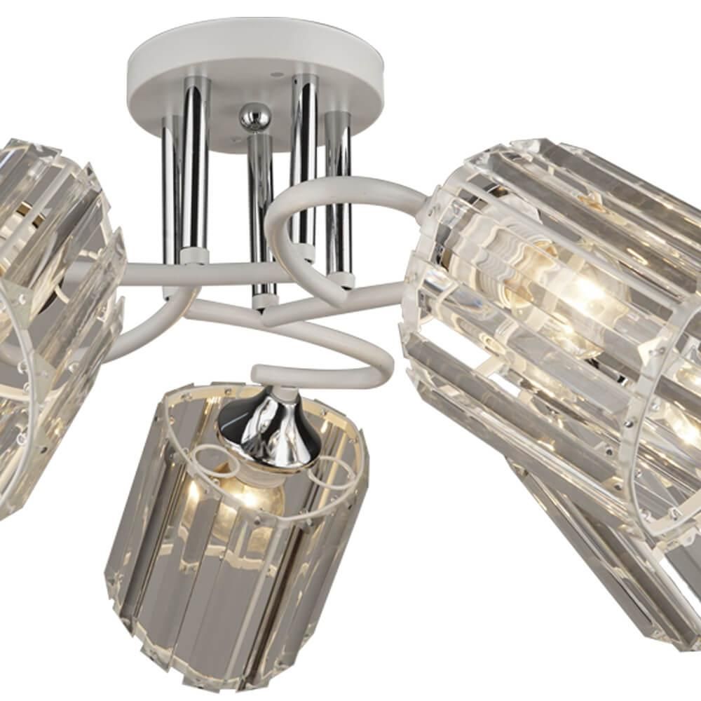 Диаметр плафона составляет 560 мм, а высота - 250 мм. Цвет плафона и абажура - белый, что создает светлое и уютное освещение в комнате. Основание выполнено из металла в белом цвете, что гармонично сочетается с хрустальными элементами.