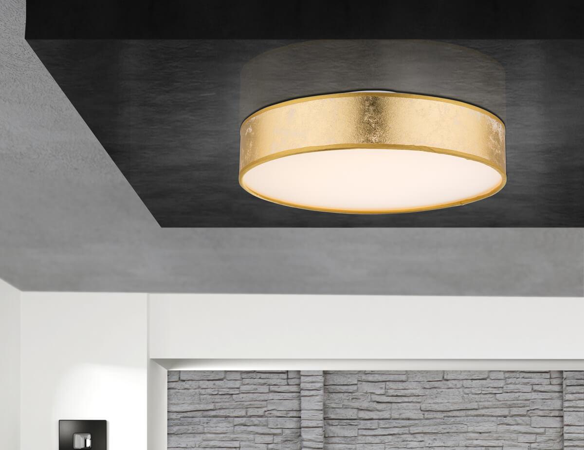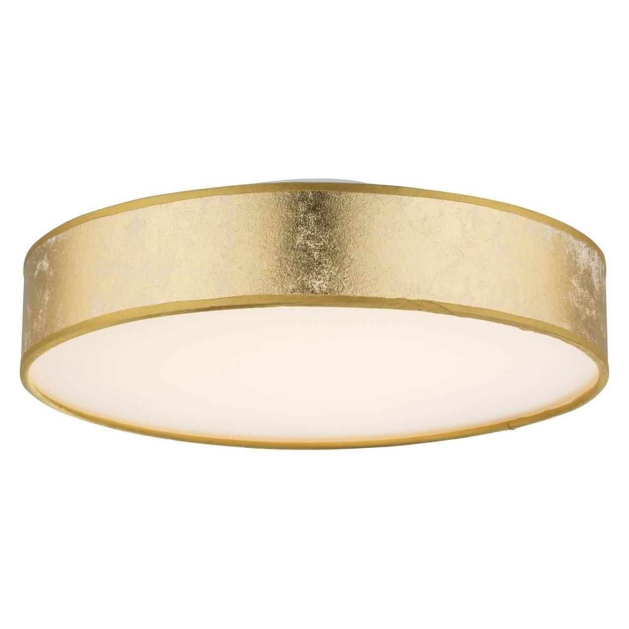 Плафон светильника изготовлен из акрила и имеет золотой цвет, что придает ему изысканный вид. Диаметр плафона составляет 300 мм, а высота - 90 мм. Основание выполнено из металла в белом цвете, что создает контраст с золотым плафоном.
