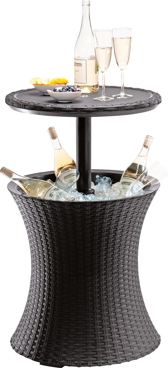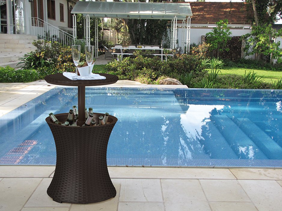Очень популярный в Европе столик теперь и в России. Компактный столик, который может регулироваться по высоте, отлично подойдет для оформления зоны отдыха у бассейна. Плетение под ротанг сочетается с шезлонгами и мебелью Keter. Во внутреннюю емкость можно положить лед или налить холодной воды для поддержания температуры ваших напитков. При необходимости емкость можно использовать для любого другого хранения.