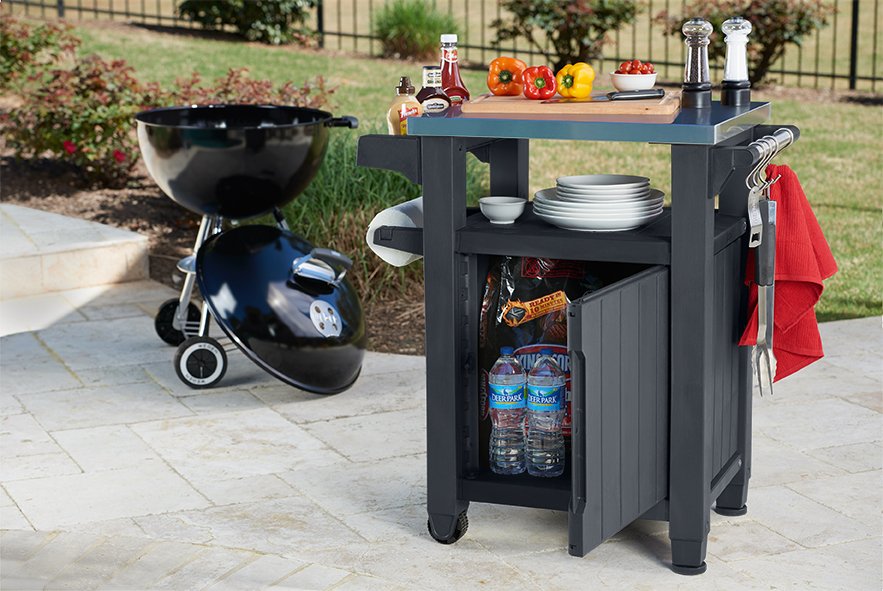Функциональное и оригинальное решение в прекрасном стиле, такое как стол для гриля, украсит любой сад или террасу. Основным преимуществом продукта является его мультифункциональность. Необычная конструкция позволяет использовать его, как стол для приготовления блюд, и как шкафчик для хранения различных продуктов и ингредиентов. Столик оснащен столешницей из нержавеющей стали, удобной ручкой с дополнительными вешалками и колесиками, благодаря которым продукт удобно перемещать в разные места. Во вместительный шкафчик можно положить подручные аксессуары, необходимые для приготовления и подачи блюд на свежем воздухе.