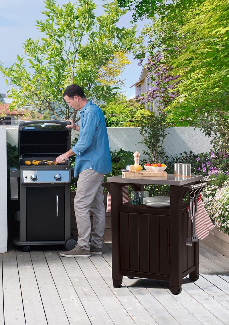 Функциональное и оригинальное решение в прекрасном стиле, такое как стол для гриля, украсит любой сад или террасу. Основным преимуществом продукта является его мультифункциональность. Необычная конструкция позволяет использовать его, как стол для приготовления блюд, и как шкафчик для хранения различных продуктов и ингредиентов. Столик оснащен столешницей из нержавеющей стали, удобной ручкой с дополнительными вешалками и колесиками, благодаря которым продукт удобно перемещать в разные места. Во вместительный шкафчик можно положить подручные аксессуары, необходимые для приготовления и подачи блюд на свежем воздухе.